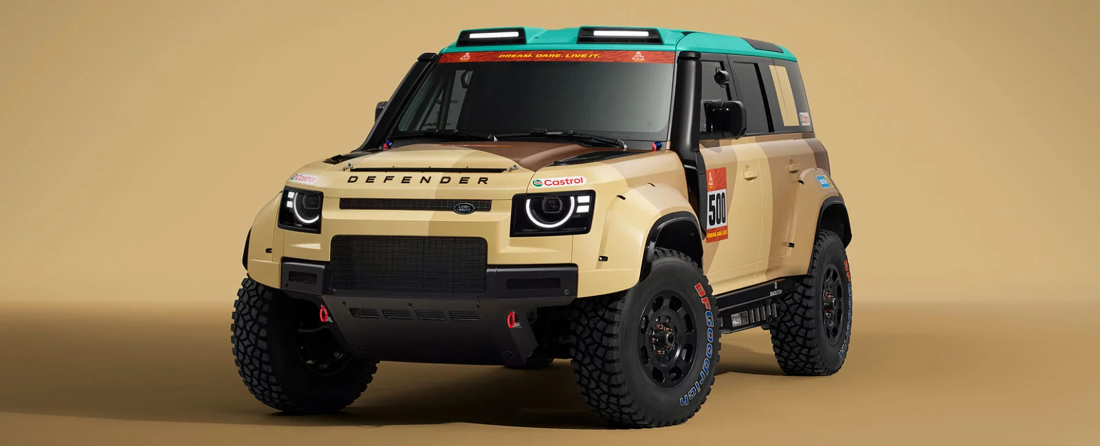 Defender Dakar D7X-R stiller op i en rå, kraftfuld og jordnær lakering, inspireret af ørkenens farver og teksturer. Det helt nye “Geopalette”-design henter sine nuancer fra de tørre, barske landskaber, der kendetegner Dakar: en kombination af sand-, sten- og jordtoner med et strejf af Aqua, inspireret af de sjældne ørkenvandløb, der tilfører både kontrast og klarhed.